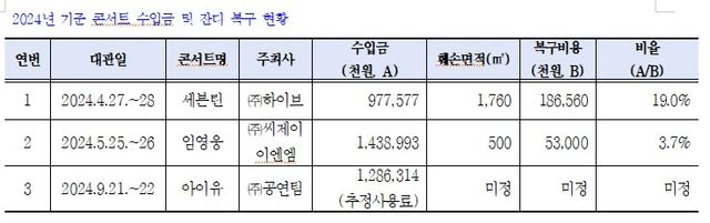 윤영희 서울시의원이 서울시설공단에서 제출받은 자료에 따르면 올해 서울월드컵경기장에서 개최된 콘서트의 잔디 훼손 면적과 원인자 복구비용은 ▲ 세븐틴 1,760㎡, 1억8656만 원 ▲임영웅 500㎡, 5300만 원 ▲아이유(미정)으로 나타났다.