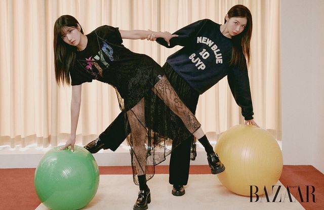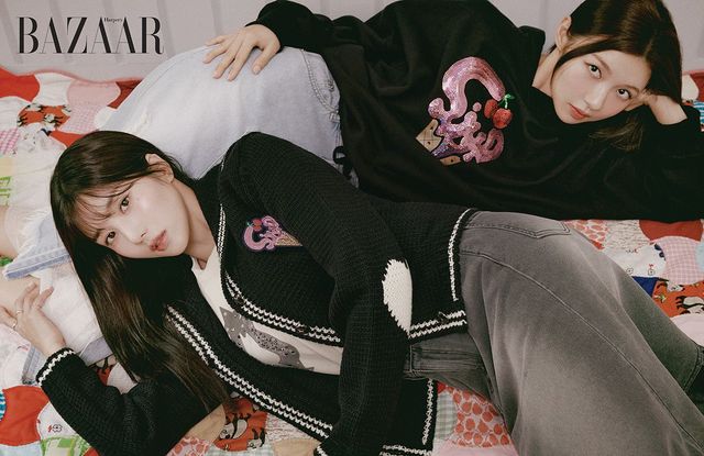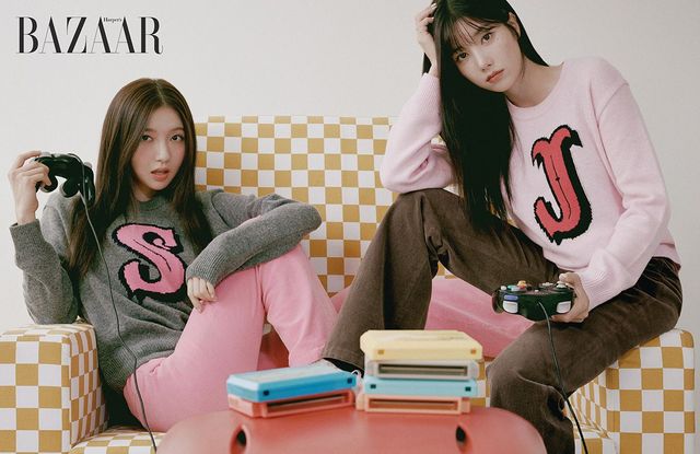 주현영이 착용한 니트 톱은 19만5천원, 데님 팬츠는 36만5천원 SJYP. 권은비가 착용한 니트 톱은 19만5천원, 데님 팬츠는 36만5천원 SJYP.