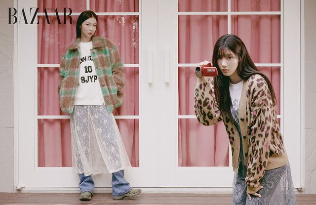 주현영이 착용한 체크 재킷은 59만5천원, 스웨트셔츠는 29만5천원, 레이스 스커트는 23만5천원, 데님 팬츠는 19만5천원 모두 SJYP. 권은비가 착용한 레오퍼드 카디건은 가격 미정, 티셔츠는 15만5천원, 레이스 슬립 원피스는 39만5천원, 데님 팬츠는 19만5천원 모두 SJYP.