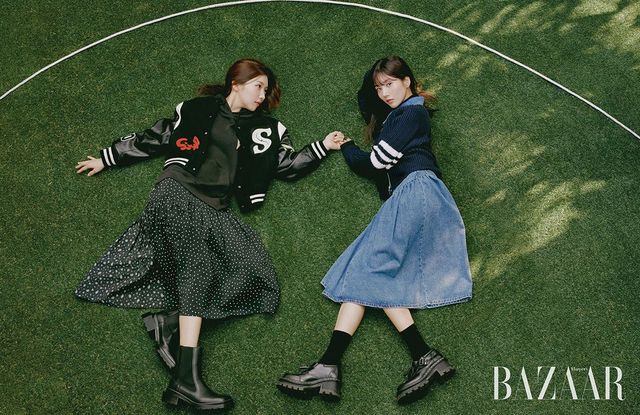 주현영이 착용한 바시티 재킷은 59만5천원, 후디 원피스는 36만5천원 SJYP. 권은비가 착용한 데님 칼라가 더해진 카디건은 39만5천원, 이너로 착용한 터틀넥 톱은 9만8천원, 데님 스커트는 29만5천원 모두 SJYP.