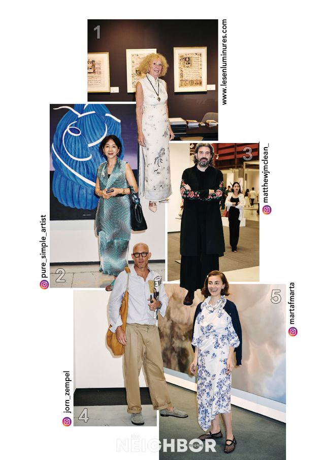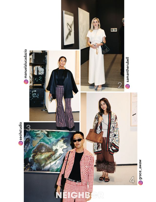 수많은 사람들 속 단번에 시선을 사로잡은 깅엄 체크 셋업! 브랜드 ‘수터스 밀(Sutter’s Mill)’ 제품으로 키치한 무드를 표현하고, 나이키의 언더웨어 밴딩을 드러내 캐주얼함을 강조했다. 렌즈 하단에 눈물처럼 진주를 단 독특한 선글라스와 레더 숄더백은 국내 디자이너 ‘김해김’ 제품. 한국에서 열리는 아트페어에 의미를 둬 한국 디자이너 제품으로 스타일링을 마무리했다.