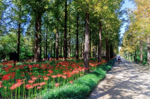 서울 마포구 난지 테마관광 숲길에 메타세쿼이아 숲을 배경으로 군락을 이룬 상사화와 꽃무릇이 활짝 피어 있다. / 마포구 제공