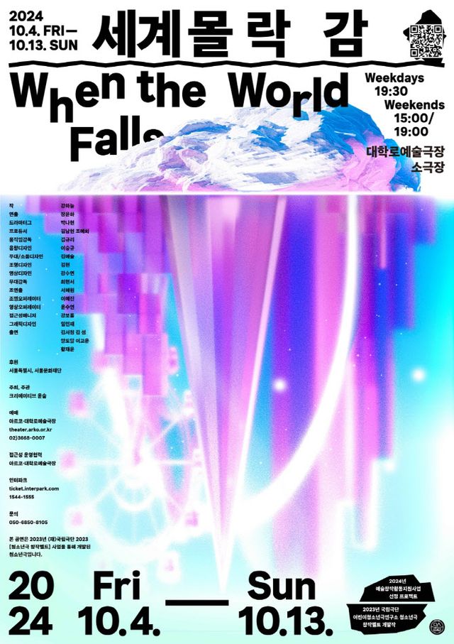 강하늘 작가가 자신의 청소년기를 되돌아보며 주목한 ‘몰락의 경험’을 바탕으로 집필한 작품이다. ‘세계몰락감’은 충격적인 경험으로 자신의 내부 세계가 완전히 무너져 자신을 감싸고 있는 외부 세계 또한 완전히 몰락할 때 느끼는 감각을 뜻한다. 작품은 현재, 윤비, 제이라는 세 명의 여자 청소년을 통해 누구나 청소년기를 지나오며 처음으로 마주하는 몰락의 경험, 그리고 기후위기로 무너져 가고 있는 세계를 함께 보여주며 관계와 성장의 경험에 관해 이야기한다. 크리에이티브 윤슬의 장윤하 대표가 연출하며 배우 이고운, 황재윤, 김서정, 김섬, 양도담 등이 출연한다.