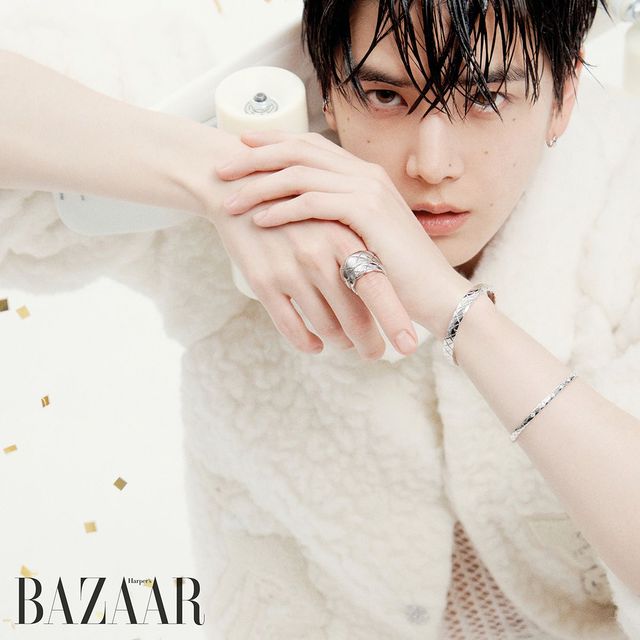 양쪽 귀에 착용한 18K 화이트 골드 싱글 이어링, 검지에 착용한 18K 화이트 골드 라지 링, 레이어드한 18K 화이트 골드 스몰 링, 81개의 다이아몬드를 세팅한 18K 화이트 골드 브레이슬릿, 18K 화이트 골드 미니 브레이슬릿은 모두 ‘코코 크러쉬’ 컬렉션 Chanel Fine Jewelry.