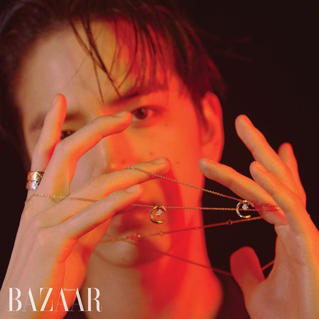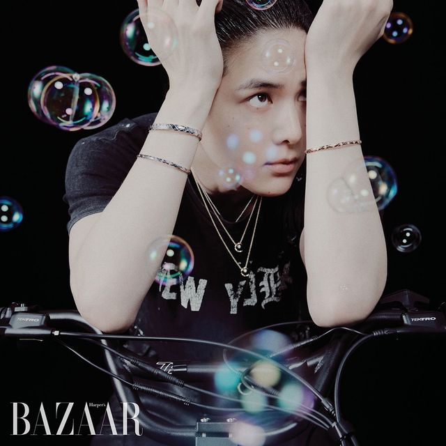 오른팔에 착용한 다이아몬드 장식의 18K 화이트 골드 브레이슬릿, 레이어드한 미니 브레이슬릿, 왼팔의 다이아몬드를 장식한 18K 베이지 골드 미니 브레이슬릿, 18K 화이트 골드 네크리스, ‘C' 모티프 중심에 다이아몬드를 세팅한 18K 베이지 골드 네크리스, 레이어드한 18K 옐로 골드 네크리스는 모두 ‘코코 크러쉬’ 컬렉션 Chanel Fine Jewelry.