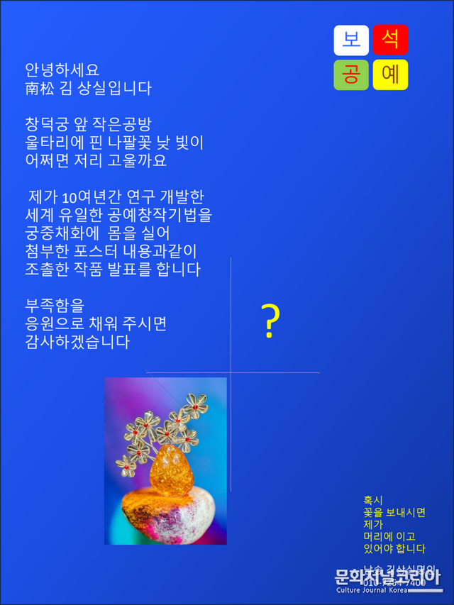 남송 김상실 작가의 보석 궁중채화는 단순한 예술 작품을 넘어 전통 문화 계승과 현대 사회의 다양한 가치를 창출하는 데 기여하는 의미 있는 작품입니다. 이번 전시회를 통해 남송 김상실 작가의 예술 세계를 만나보시고, 궁중채화와 보석공예의 아름다움을 느껴보시기 바랍니다.