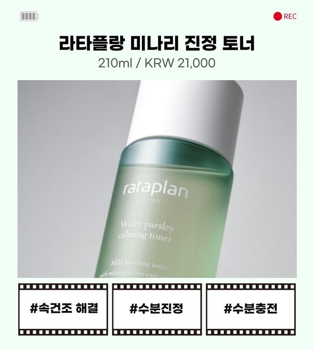 라타플랑 미나리 진정토너는 청정지역인 순천만에서 건강하게 자란 무농약 미나리 추출물을 담아 환절기 큰 기온차로 예민해진 피부를 건강하고 촉촉하게 수분케어해줄 수 있는 제품! 한 번만 사용해도 피부 온도가 눈에 띄게 내려간 것을 느낄 수 있으며, 닦토, 흡토 모두 다 가능하다는 사실! 사용 후엔 끈적임이 없어 라타플랑 미나리 진정토너 사용 후 베이스 메이크업을 하면 화장을 챱챱 잘 먹기까지 한다.