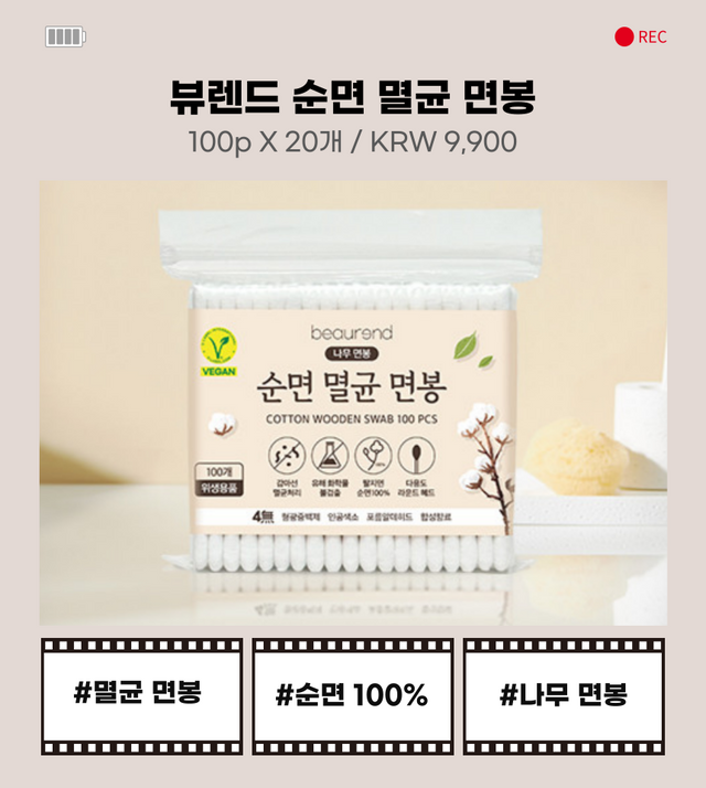 뷰렌드 순면 멸균 면봉은 튼튼한 나무 심지와 100% 순면으로 만들어졌고, 감마 멸균처리 방식을 통해 제작되어 감염, 세균, 유해 물질로부터 안전하다. 또 비건 위생용품 인증 마크도 획득하였기 때문에 더욱더 믿고 사용할 수 있는 제품이라는 사실!