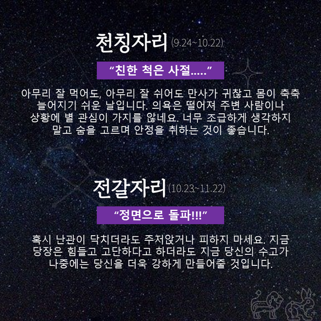 크게 당신을 괴롭히는 문제가 발생하지는 않지만 왠지 마음의 갈피를 잡을 수 없네요. 계절을 타는 것인지도 모르겠습니다. 하지만 이럴 때일수록 당신의 스타일을 고집하도록 하세요. 갑작스러운 변화는 오히려 역효과를 낼 수도 있습니다.