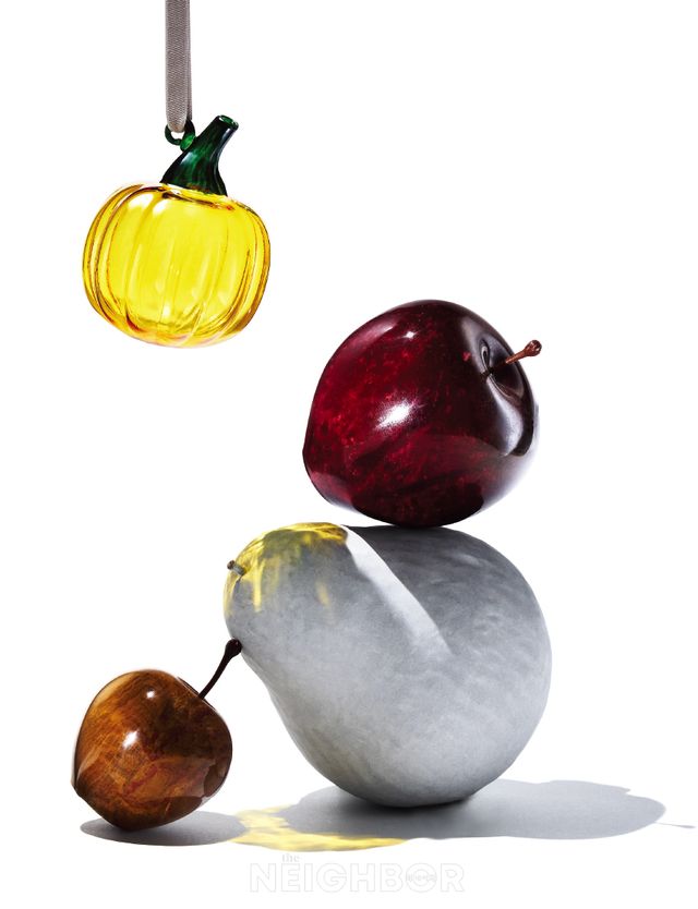한 곳에 과일과 채소 오브제를 모으고 보니 소재와 형태가 저마다 다르다. 같은 나무에서 열린 열매가 조금씩 다르듯이. 포인트오브뷰를 상징하는 과일인 사과 오브제는 반질반질 윤이 나는 실제 사과를 닮았다. 대리석의 묵직한 무게감 덕에 문진으로 사용하기 좋다. 유약을 바르지 않은 김규태 작가의 서양배 오브제는 광택 없는 흰 빛깔이 차분하다. 책장이나 선반에 올려두고 물건을 찾는 틈에 가끔 눈길을 줄 테다. 이딸라의 유리 오너먼트는 빛 아래서 색 그림자를 드리운다. 오너먼트 세트를 가까이 걸어두면 서로 부딪치며 영롱한 소리를 내는데 종소리처럼 공간을 환기한다.