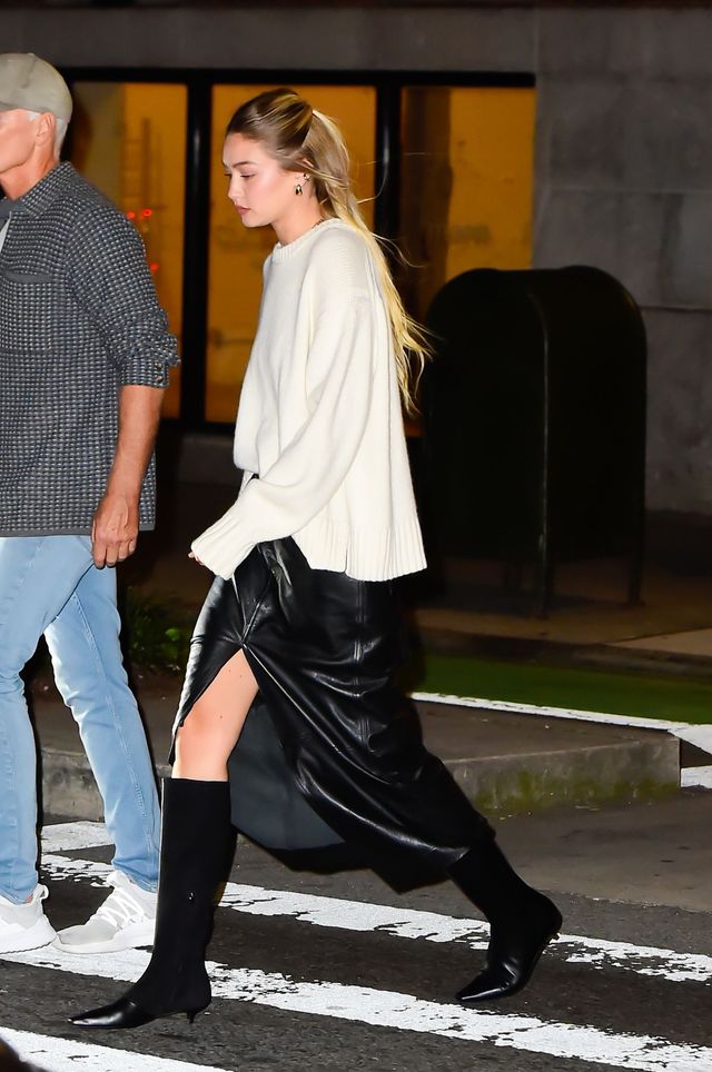 지지 하디드의 아웃핏을 참고하세요. 걸을 때마다 스커트 사이로 허벅지 라인이 과하지 않게 드러나 더욱 매력적이로 느껴집니다.