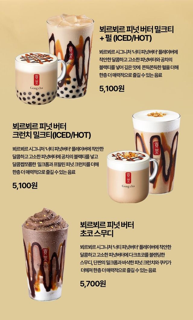 ‘피넛버터 밀크티+펄’은 달콤하고 고소한 피넛버터의 풍미에 공차만의 향긋한 블랙티를 더해 깊고 부드러운 맛을 자랑하는 음료다. 쫀득쫀득한 펄을 곁들여 씹을수록 고소하면서도 은은한 단맛이 조화를 이루며, 입안 가득 오래 여운을 남긴다. 차가운 음료와 뜨거운 음료 두 가지 중 선택할 수 있다.