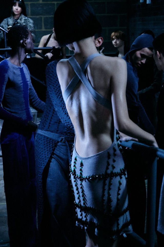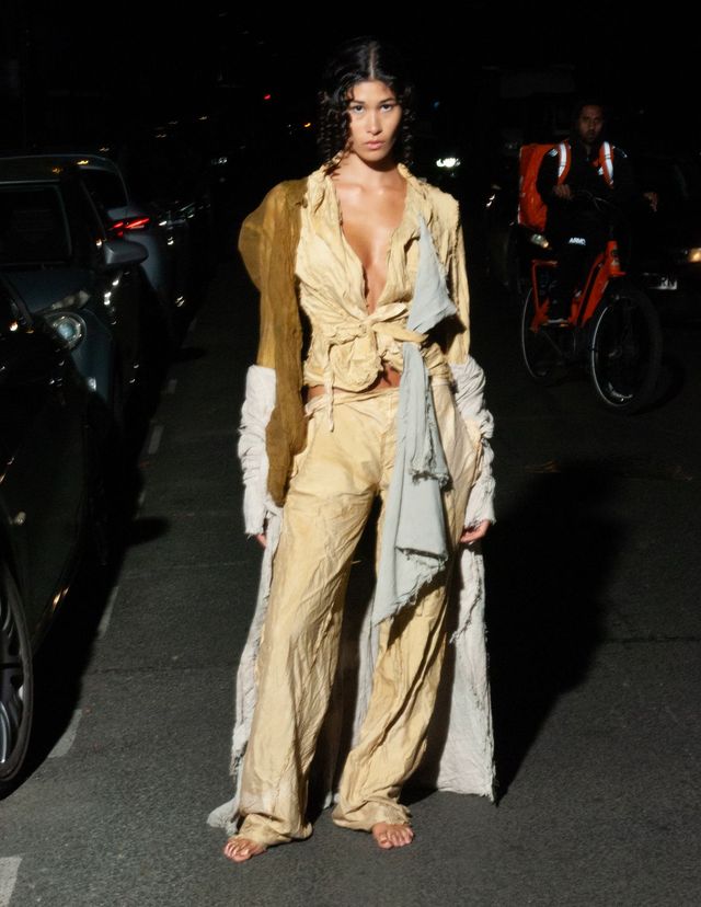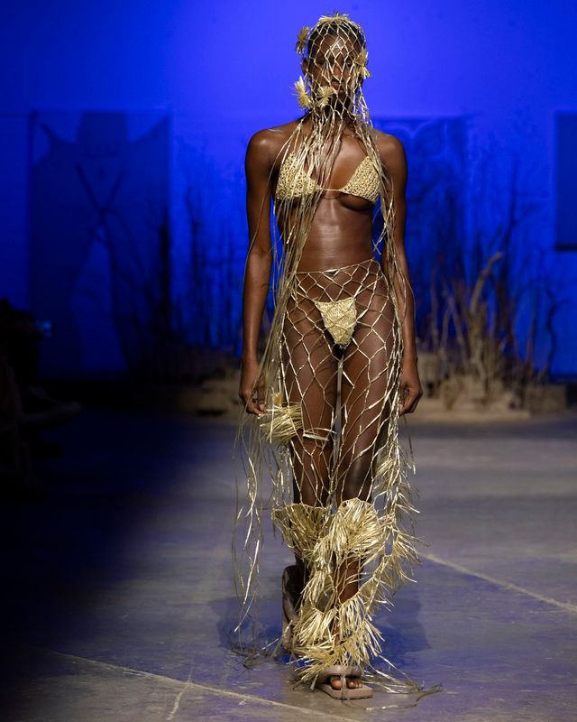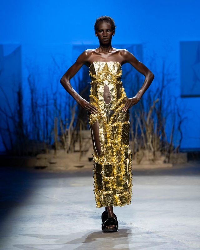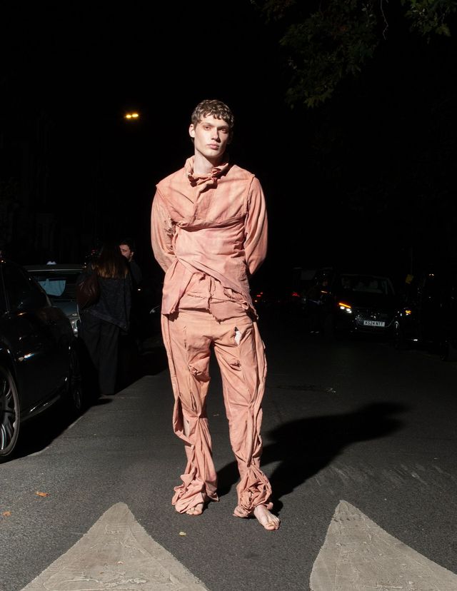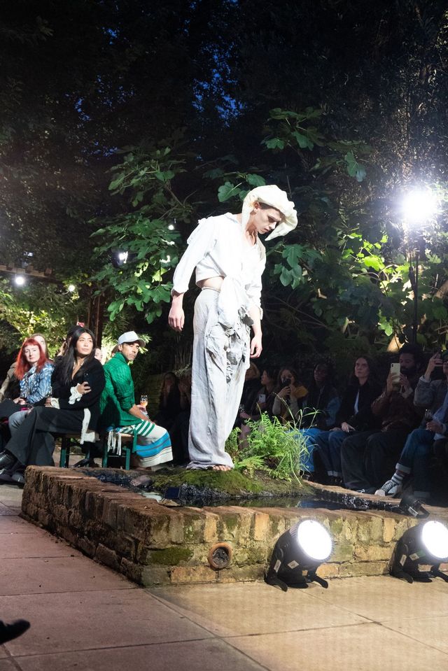2024 LVMH프라이즈 파이널리스트에 오른 파올로 카르자나(Paolo Carzana)가 자신의 컬렉션을 선보이고자 선택한 곳은 해크니에 위치한 자신의 집 뒷마당. 부모님과 함께 가꾼 작은 정원은 핸드메이드 컬렉션 속에 담긴 그의 상상을 실현하기에 충분했다. 허영심으로 가득 찬 세상이 끔찍하다고 말하는 파올로. 쇼의 시작을 알리며 등장한 ‘나르시스’는 자기 자신에게 사랑에 빠지지 않고 오히려 물에 비친 자신으로부터 등을 돌렸다. 그리곤 그가 걸어가는 런웨이 위를 다른 이들을 위해 밝혀주었다. 인디고와 히비스커스로 염색한 푸르고 붉은 색, 강황과 블랙 티로 만든 이끼처럼 차분한 그린, 로그우드와 블랙 월넛, 코치닐을 조합해 흙색 빛이 도는 퍼플. 천연 재료로 염색한 오가닉 원단들에서 지구를 생각하는 마음이 누구보다 진심인 것을 또 한 번 느낄 수 있다. 자신의 작업을 펼칠 수 있는 데는 뉴젠 프로젝트를 비롯해 도움을 주는 모든 사람 덕분이라고 말하는 파올로. 이타적 삶과 그의 옷은 평행한 길을 걷고 있다.