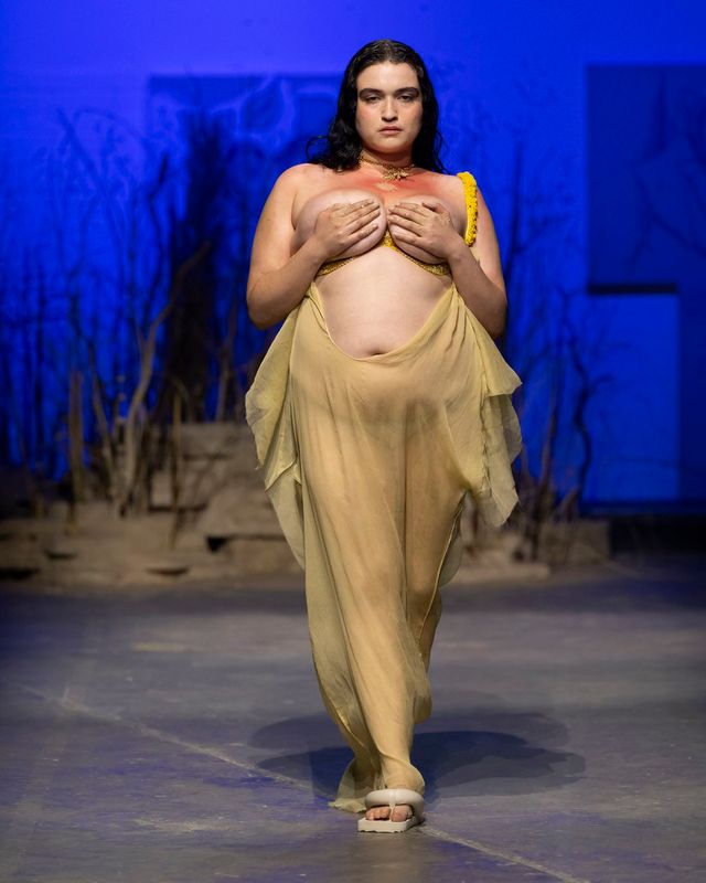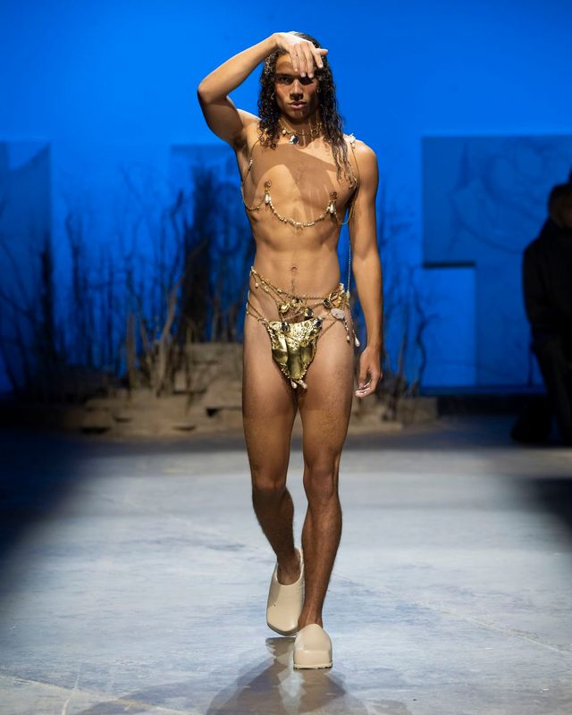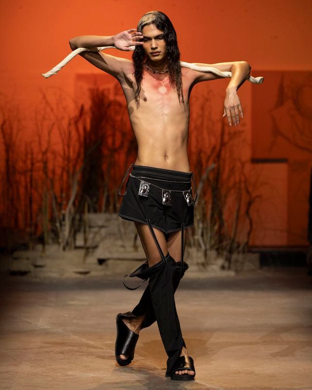 인간의 내면과 감정을 탐구하고 신화적 요소를 가미해 신비로운 분위기를 자아내는 디 펫사(Di Petsa). 순수예술과 행위예술을 전공한 그리스 출생의 디자이너 디미트라 펫사는 퍼포먼스로 관중들의 눈앞에 신화 한편을 옮겨놓는다. 아리아드네와 테세우스의 신화에서 시작된 이번 컬렉션의 관전 포인트는 역시나 몽환적인 걸음으로 나타난 모델들의 퍼포먼스. 이들은 강렬한 태양을 피하고자 손으로 햇빛을 가리는 듯한 동작을 취하기도 하고, 붉은 실에 묶여 어디론가 사라지기도 했으며, 남성과 여성은 서로를 밀어내고 껴안기를 반복하기도 했다. 욕망과 상실, 그리고 사랑을 찾아가는 여정을 엿볼 수 있는 컬렉션에서 마주한 여름의 조각들. 태양에 그을린 피부와 물에 젖은 듯한 시그니처 '웻룩(Wet Look)', 그리고 모래에 엉킨 머리카락까지, 디 펫사가 펼쳐낸 여름 신화를 감상해 보길.
