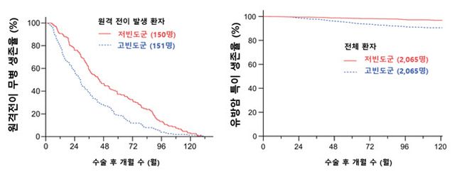 연구팀은 전체 환자들의 원격 전이 검사 빈도의 중앙값을 기준으로 ▲고빈도 검사군 ▲저빈도 검사군으로 나눈 후 9년 2개월 동안 추적 관찰하며 생존율을 분석했다.
