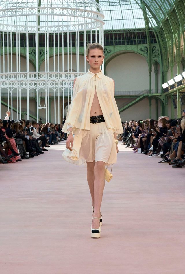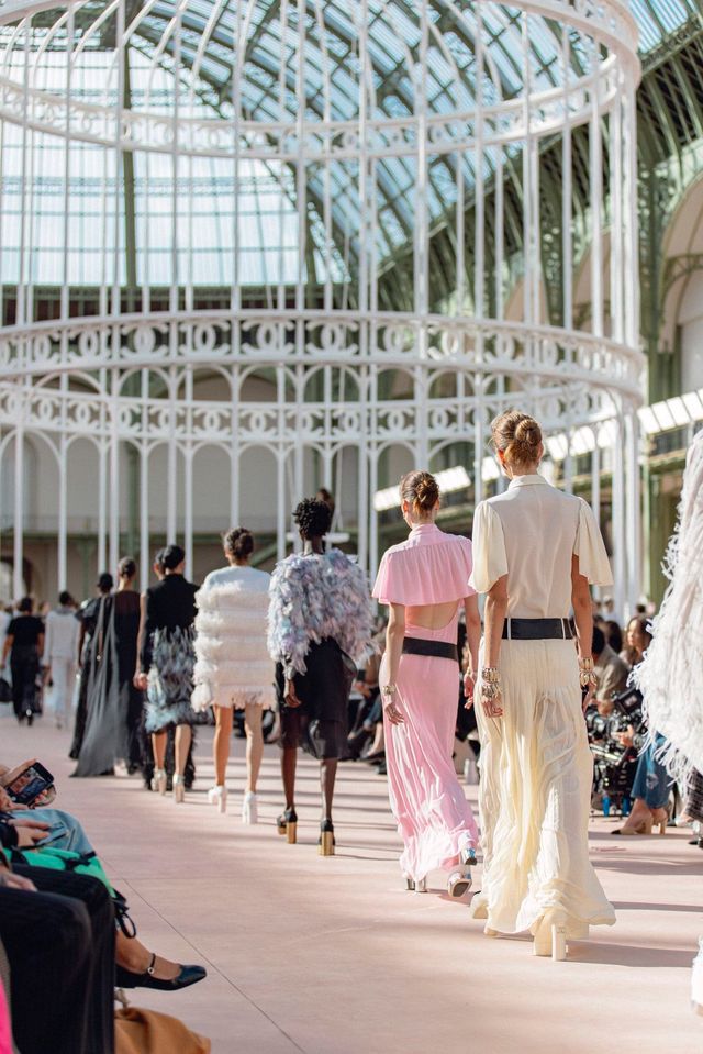 이것이구나. 그랑 팔레의 본당 중앙에 설치된 거대한 새장 조형물이 결정타처럼 잠시 잊고 있었던 느낌을 불러냈습니다. 하나하나가 기념비적인 그랑 팔레의 샤넬 쇼 하면 놀라운 크기의 오브제와 물성이 시각적 인장처럼 번뜩 떠오르는 법이죠. 더블 C 로고를 두른 새장의 활짝 열린 문은 2025 봄-여름 레디-투-웨어 쇼의 테마를 상징합니다. 샤넬 크리에이션 스튜디오는 이번 쇼를 공중으로 날아오르는 것에 대한 스토리와 초월적인 자유의 발레로 설명했는데요. 여기에 더해 이번 컬렉션은 가브리엘 샤넬처럼 불편하고 거추장스러운 사회의 시선과 관습에서 벗어난 여성들에게 바치는 헌사라고 덧붙였습니다.