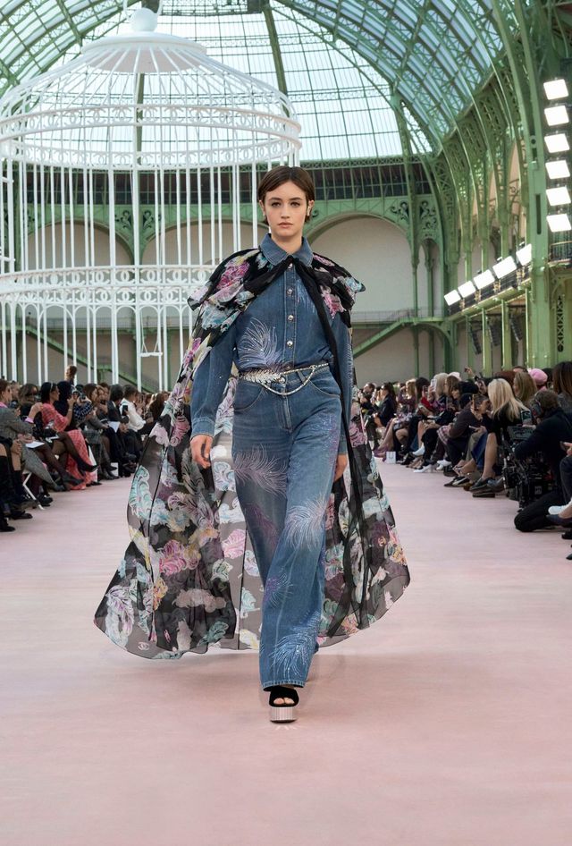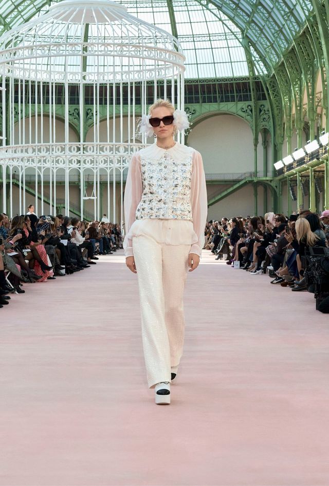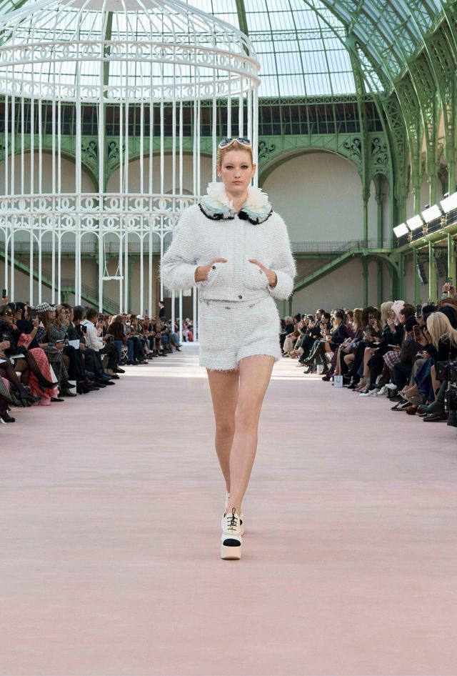 우아하게 펄럭이는 시폰 케이프와 반투명 실크 스커트, 다채로운 깃털 프린트로 수놓은 드레스, 블라우스, 트렌치코트 그리고 폭이 넓고 유동적인 팬츠와 화이트 룩의 향연은 자유로움과 해방감, 가벼움과 역동성에 대한 찬가나 다름없습니다. 대담하고 자신감 넘치는 실루엣과 피터팬 칼라를 단 보머 재킷, 점프 수트와 넥타이 모양 인서트를 단 정장은 또 어떻고요. 가브리엘 샤넬의 절친이자 문학가인 콜레트, 1920년대 여성 해방 운동을 상징하는 가르손느, 깨어있는 언행으로 위로 나아간 여성 비행사들의 존재를 21세기의 그랑 팔레에 재현하다시피 했습니다. 피날레는 엘비스 프레슬리의 손녀이자 샤넬의 앰버서더 라일리 키오가 장식했는데요. 새장 안의 대형 그네에 몸을 맡긴 채 블랙 케이프를 길게 휘날리며 그녀가 부른 노래의 제목은 ‘When Doves Cry’.
