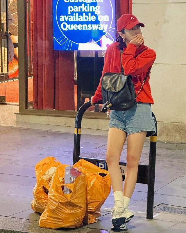 지금까지도 꾸준히 유행 중인 샤넬의 빈티지 백팩을 선택한 기은세. 빈티지 제품 특유의 넉넉한 사이즈와 투박하지만 클래식한 멋이 묻어 나오는 로고 장식의 빈티지 샤넬 백팩에 선명한 레드 컬러 톱과 데님 쇼츠를 매치했다. 무심하게 눌러쓴 레드 컬러 볼캡과 양말, 스니커즈의 조합 역시 빈티지 샤넬 백팩과 완벽한 조화를 이룬다.