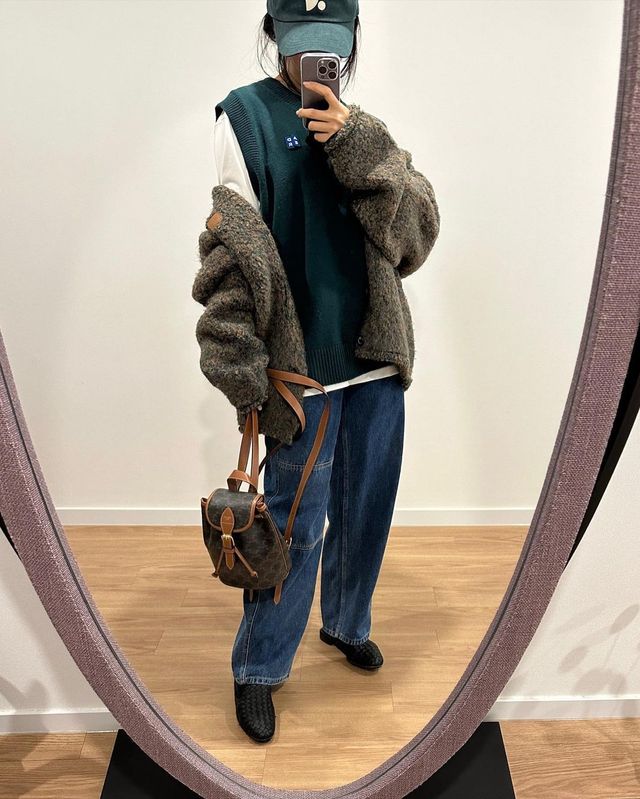 가을을 건너뛰고 왠지 겨울이 금방 올 것 같은 요즘, 추위에 맞서 단단히 채비를 마친 효민의 ‘거셀’ 사진에서 눈에 띄는 건 단연 클래식한 로고 프린트의 미니 사이즈 백팩이다. 수십 년 전 유행했던 로고를 그대로 차용해 베스트셀러에 등극한 셀린느의 트리옹프 백팩으로 니트 베스트, 데님 팬츠로 꾸민 캐주얼룩에 고급스러운 포인트를 더했다.