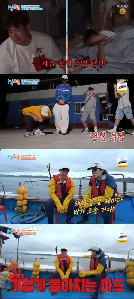 6일 방송된 KBS 2TV '1박 2일 시즌4'에서는 김종민과 유선호가 같이 대하조업에 나서는 모습이 전파를 탔다.