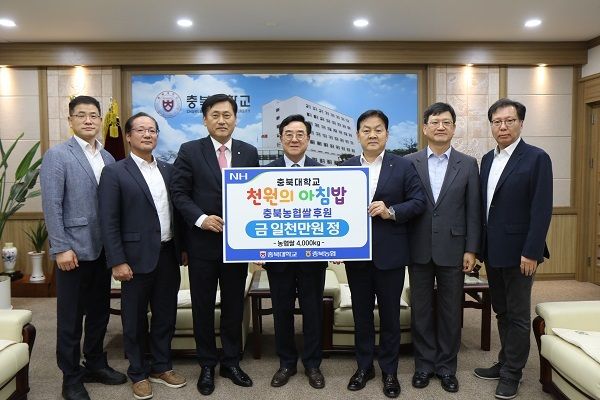 황종연 농협중앙회 충북본부 총괄본부장과 임세빈 농협은행 충북본부장은 “미래의 주축이 될 우리지역 대학생들이 아침밥을 통해 건강한 식습관과 아침밥 먹는 문화가 확산되어 건강한 대학생활을 통해 충북을 빛낼 큰 인재가 되길 바란다”며 지역 인재 양성에 헌신하는 충북대에 감사의 의미를 담아 전달했다.