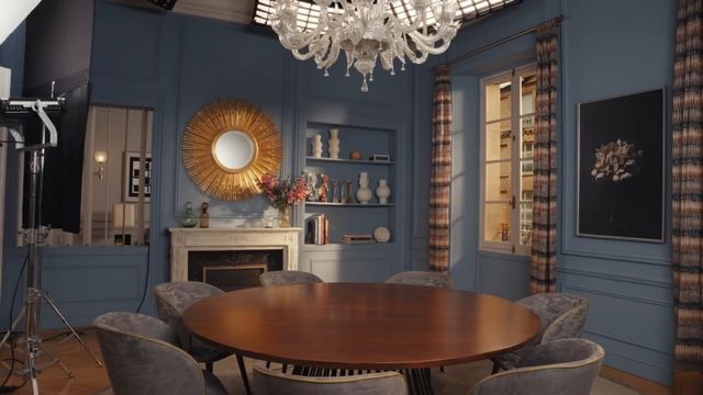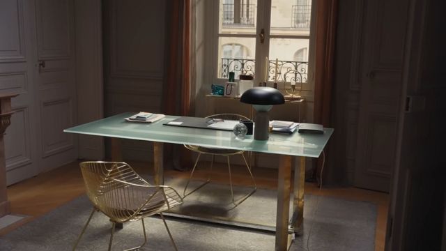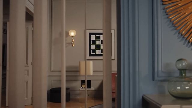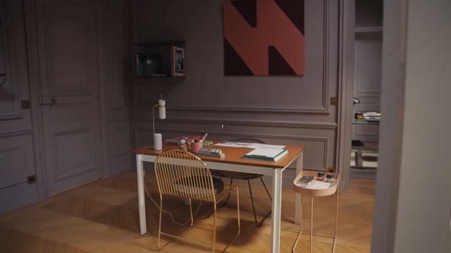 실비의 개인 사무실입니다. 건축적 미가 돋보이는 유리 테이블과 독특한 무광 램프를 보면 실비의 시크한 성격이 간접적으로 드러나요. 역시나 파리 아파트의 특징인 벽난로를 설치했고, 선반 위에는 기하학적 아름다움이 돋보이는 양초와 산호초 오브제를 가지런히 정리했어요. 과하지 않은 고급스러움이라는 표현이 정확히 어울리는 인테리어입니다.