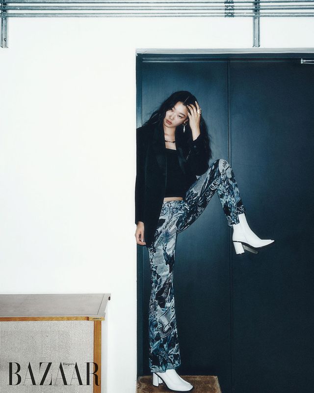 재킷은 Saint Laurent by Anthony Vaccarello. 이너 톱은 Jacquemus. 팬츠는 Acne Studios. 귀고리는 Bottega Veneta. 반지는 Celine by Hedi Slimane. 부츠 힐은 Louis Vuitton.