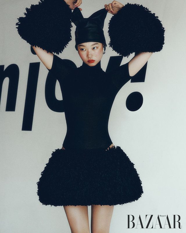 보디수트, 폼폼 모티프 스커트, 슬리브는 모두 Alaïa. 레더 비니는 Louis Vuitton. 오버사이즈 귀고리는 Saint Laurent by Anthony Vaccarello.