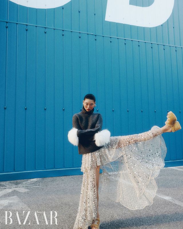터틀넥 톱, 엠브로이디드 스커트, 이너 쇼츠, 귓불에 착용한 귀고리, 퍼 장갑은 모두 Louis Vuitton. 양쪽 귀에 레이어드한 이어커프는 모두 Portrait Report. 시어링 슈즈는 Celine by Hedi Slimane.