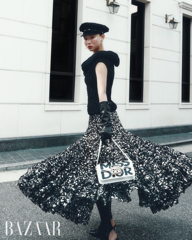 니트 톱은 Givenchy. 스커트는 Louis Vuitton. 깃털 장식 캡은 Prada. 귀고리는 Gucci. 장갑은 MaxMara. ‘미스 디올’ 플랩 백은 Dior. 부츠 힐은 Acne Studios.