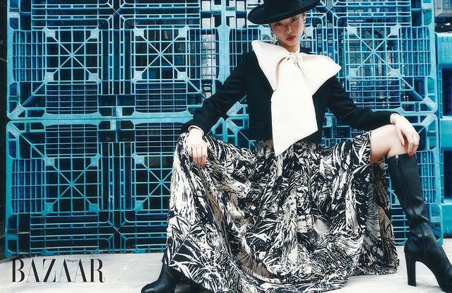 재킷, 보 장식 블라우스, 재킷은 Celine by Hedi Slimane. 패턴 스커트는 가격 미정, 페도라는 1백94만원 Loro Piana. 귀고리는 Moschino. 부츠 힐은 Chanel.