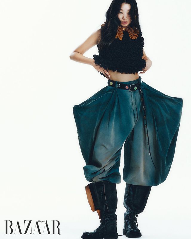 부클레 톱, 드레이프 팬츠는 Loewe. 귀고리는 가격 미정, 크리스털 반지는 70만원, 레이어드한 반지는 34만원 모두 Valentino Garavani. 병뚜껑 모티프 벨트는 2백98만원대 Balenciaga. 부츠는 Miu Miu.