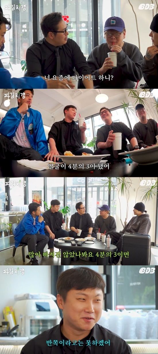 빠니보틀은 "얼굴이 4분의 3이 됐다"고 했고, 곽튜브는 "4분의 3이면 많이 빠지지는 않았나보다"라고 너스레를 떨었다. 빠니보틀은 "반쪽이라고는 못하겠다"고 이야기해 웃음을 더했다.