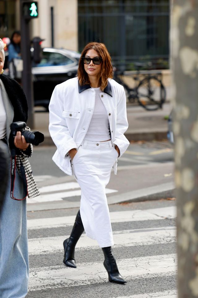 트린 키에르는 빈티지한 무드의 펀칭 디테일이 있는 화이트 스커트 아래 데님을 입고 넉넉한 실루엣의 재킷을 더했습니다. 샌들이나 부츠였으면 자칫 심심할 뻔했을 룩이 데님 하나로 근사해졌죠?