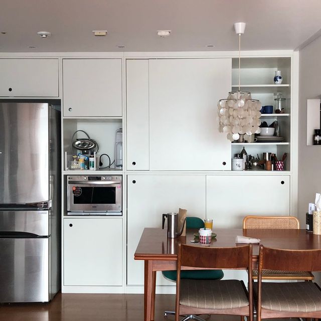 저희 집에는 처음부터 붙박이장이나 팬트리가 없었어요. 그런데 소품이 너무 많아서 복닥복닥했죠. 이사를 가지 않고 한 집에 10년 가까이 살다 보니 물건이 점점 많아지기만 했고요. 그래서 주방만 리모델링하기로 결정하고 수납장 짜 넣는 것부터 기획해 나갔어요. 한쪽 벽면에는 미닫이 수납장을 설치하고, 냉장고장이 있던 위치에는 가벽을 두어 공간을 넓게 뺐어요. 인테리어 스튜디오 라이크라이크홈(@likelikehome) 손명희 실장님의 도움이 있었기에 제가 상상했던 주방의 모습을 그려 나갈 수 있었던 것 같아요.