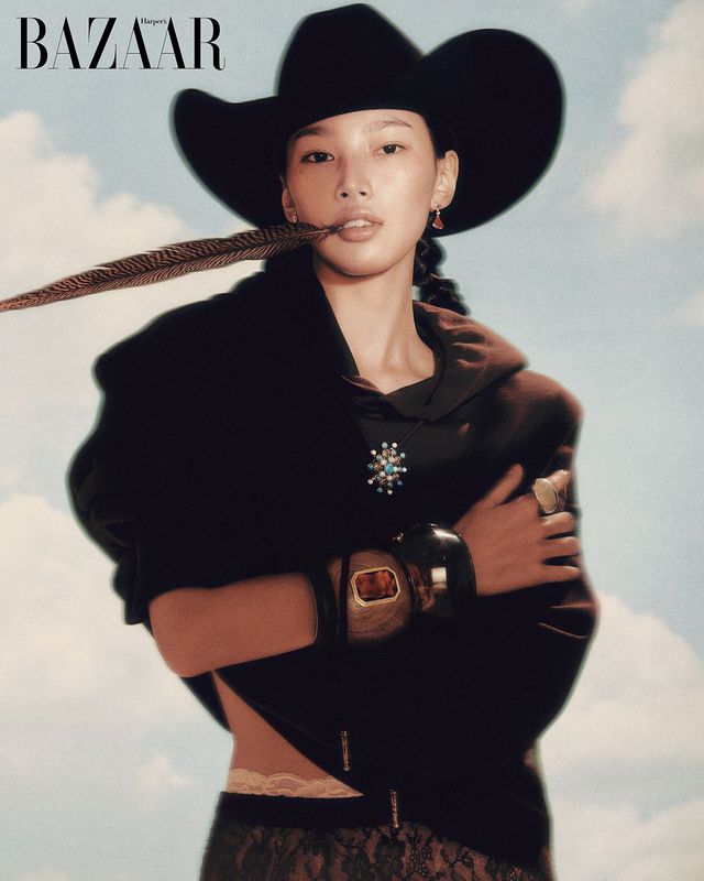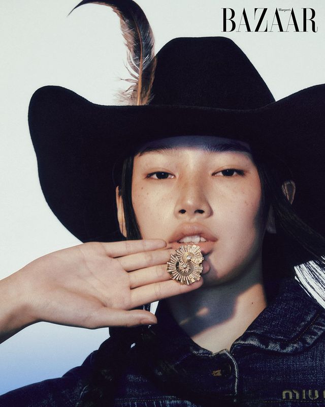 18K 로즈 골드에 2백46개의 다이아몬드를 장식한 ‘선라이트’ 반지는 Piaget. 데님 재킷은 Miu Miu. 카우보이 모자는 에디터 소장품.