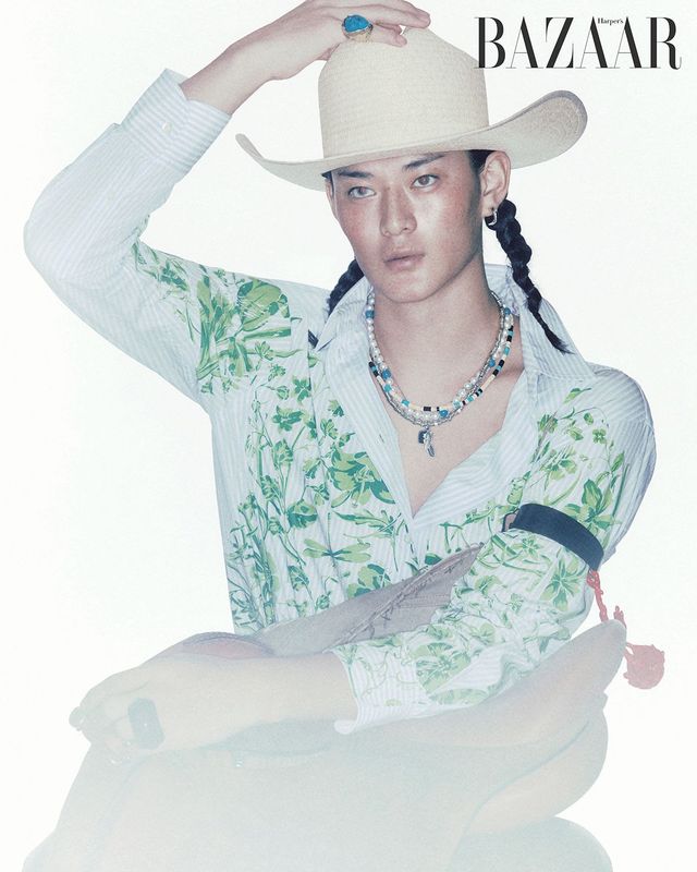 뿔 모티프에 아고야 진주를 장식한 ‘데인저 호른 다이아몬드 파베’ 귀고리는 2백18만원 Tasaki. 진주 목걸이는 2백18만원 Louis Vuitton. 튀르쿠아즈가 돋보이는 비즈 목걸이, 깃털 펜던트 장식 목걸이는 각각 4만원대 Knd. 레이어드한 블랙 오닉스 펜던트 목걸이는 50만원대 Tom Wood. 왼팔에 착용한 장미 모티프 팔찌는 McQueen by Seán McGirr. 왼손 약지에 착용한 반지는 2만원대 H&M. 오른손 소지에 착용한 반지는 Zara. 프린트 셔츠는 Gucci. 오버올은 Sacai. 스트로 소재 모자는 63만원대 Nozomi Kurokawa by W2kend Shop.