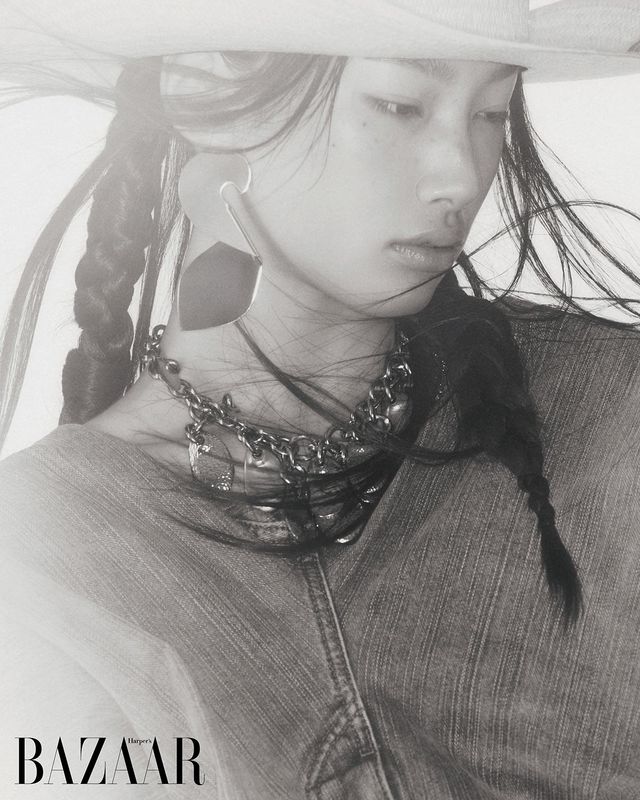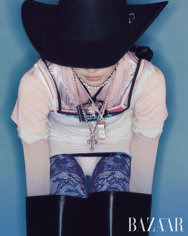 다이아몬드를 세팅한 ‘샹스 인피니 크레이지 8’ 목걸이는 Fred. ‘벨 에포크’ 목걸이는 Damiani. 휘슬 펜던트 목걸이, 그 아래 착용한 십자가 모티프 목걸이는 Chrome Hearts. 볼드한 로고 펜던트 장식 스트랩 목걸이, 레이어드 디테일 슬리브리스 톱, 이너 톱, 타이츠, 부츠는 모두 Balenciaga. 카우보이 모자는 Justin Boots.