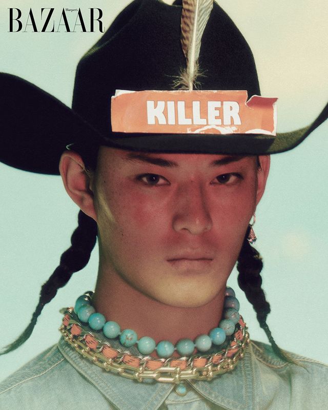블루 토파즈 장식 ‘몽마르뜨’ 귀고리는 9백81만원대 Korloff. 튀르쿠아즈 목걸이는 65만원 Scho Jewelry. 스트랩과 체인이 조화로운 목걸이는 Balenciaga. ‘티파니 하드웨어’ 목걸이는 Tiffany & Co.. 데님 셔츠는 Louis Vuitton. 카우보이 모자는 Justin Boots.