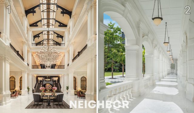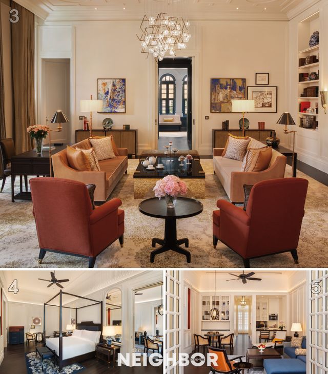 3 메인 빌딩에 위치한 프레지덴셜 스위트의 거실. 호텔에서 가장 넓은 객실이다. 4 침실과 거실, 베란다를 갖춘 그랜드 호텔 스위트. 5 래플스 아케이드에 자리한 레지던스 스위트.