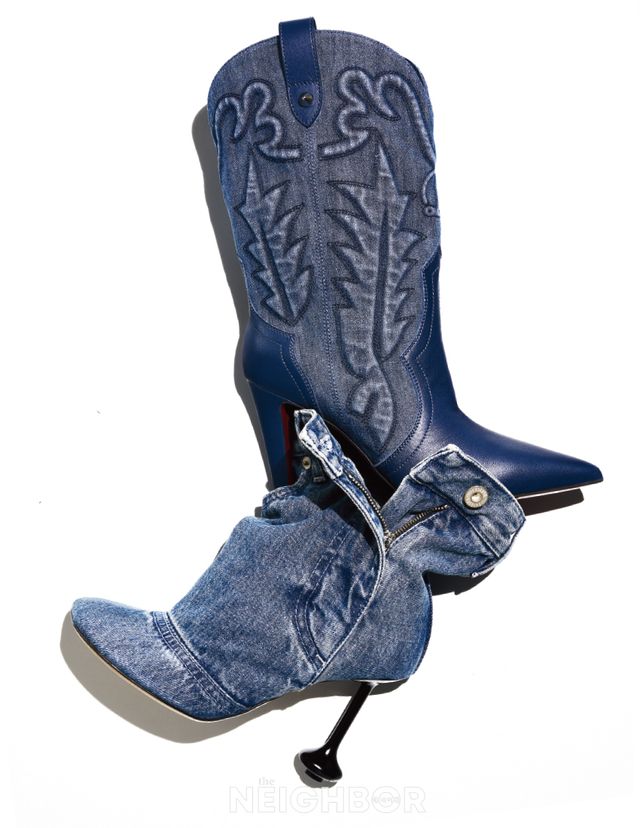 이번 2024 F/W 시즌엔 유난히 창의성이 돋보이는 부티가 많이 등장했다. 그중 가장 시선을 끈 건 바로 데님 소재 부티. 데님을 사용한 것도 독특한데, 저마다 강한 개성을 드러내 더 인상적이다. 크리스찬 루부탱은 계속해서 주목받고 있는 웨스턴 트렌드를 반영해 카우보이 부츠의 아이덴티티를 내장한 부티를 선보였다. 분명 섹시한 부티 형태인데 측면 자수, 나파 가죽 소재를 덧댄 뱀프 등 카우보이 부츠의 요소를 갖춘 이중적인 모습이 매혹적이다. 로에베는 작년부터 계속 선보인 ‘토이 부티’의 데님 버전을 내놓았다. 데님 팬츠를 업사이클링한 듯한 착각을 일으킬 정도로 데님 팬츠의 모든 요소를 그대로 담았다. 실제 팬츠 지퍼를 내리듯 측면에 여닫을 수 있는 지퍼 디테일을 구현해 로에베 특유의 독특한 상상력을 표현했다.