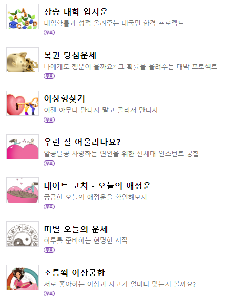 자신의 상황에 따라 재물운, 애정운, 자녀운, 궁합, 타로, 예언 등 다양한 정보를 쉽게 제공받을 수 있으니 미래를 엿보고, 자신의 운을 통해 더 나은 선택을 하고 싶은 사람들은 본 사이트를 주목해 보자.