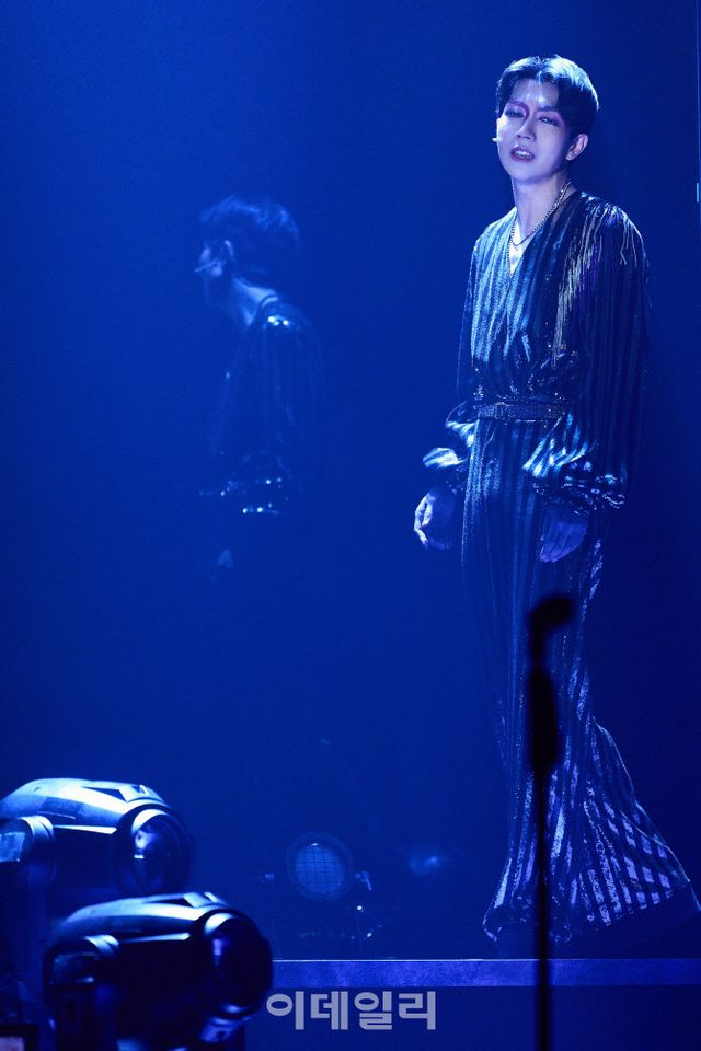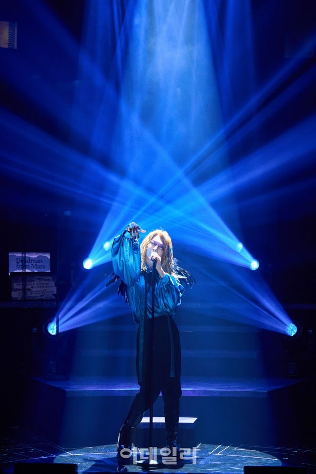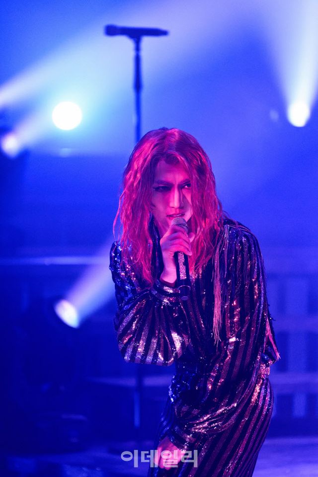“글램록을 대표하는 뮤지션인 데이빗 보위의 영상을 찾아보며 캐릭터를 연구했어요. 무대 위에서 엄청난 포스와 에너지를 발산하는 면을 캐치하기 위해 퀸의 보컬 프레디 머큐리 영상도 참고했고요. 아무래도 비주얼적으로는 데이빗 보위에게 영감을 얻으려 했는데요. 마른 모습이 건장한 제 모습과 너무 거리감이 느껴져서 10kg 가까이 감량하기도 했어요. 난생처음으로 도전한 눈화장 연기는 분장 선생님께 레슨을 받은 결과물인데요. 처음엔 걸음마 떼는 아이처럼 굉장히 서툴렀는데 지금은 시간이 충분히 남을 정도로 실력이 향상됐습니다. 하하.”