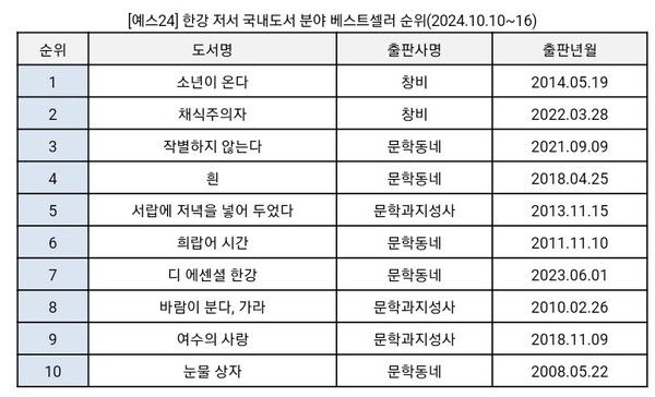 노벨문학상을 수상한 한강 작가의 저서들이 1위부터 10위를 모두 차지했다. 먼저 역사적 트라우마에 맞선 한강의 대표작 <소년이 온다>가 1위를 차지했다. 지난 2016년 맨부커상 수상으로 주목받기도 했던 <채식주의자>가 2위에 자리했고, 비극의 역사 속에서도 한줄기 빛을 향해 나아가는 인간의 존엄을 그린 <작별하지 않는다>가 3위를 기록했다. 더럽혀지지 않는 어떤 흰 것에 관한 이야기 <흰>이 4위, 한강 작가의 첫 시집 <서랍에 저녁을 넣어 두었다>가 5위에 자리했다.