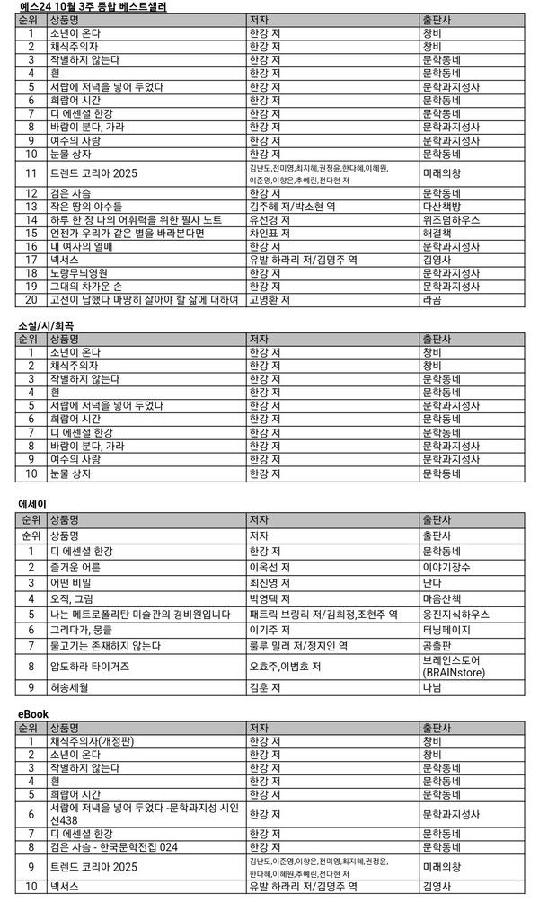 eBook 분야에서는 노벨문학상 수상자 한강 작가의 저서들이 1위에서 5위까지 나란히 자리했다. <채식주의자(개정판)>이 1위, <소년이 온다>가 2위에 올랐고, <작별하지 않는다> <흰> <희랍어 시간>이 각각 3~5위를 기록했다.