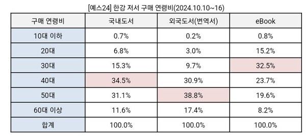 한강 작가 도서는 30대부터 50대까지 다양한 연령층의 사랑을 고루 받았다. 예스 24의 구매 연령비 데이터에 따르면, 노벨문학상 수상 이후 국내도서에서는 40대가 34.5%로 구매를 견인했고, 외국도서는 50대가 38.8%, eBook에서는 30대가 32.5%로 1위를 차지했다.