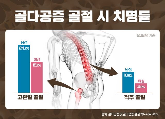 골다공증 골절 발생 시 치명률은 남성이 여성에 비해 높다. 주로 고관절, 척추, 대퇴골, 손목, 상완골 등에 골정이 생기는데 이 중 고관절이나 척추 골절 발생 후 사망률이 높다. 회복될 때까지 장기간 누워서 생활해야 하는데 그 사이에 다양한 합병증이 발생하기 때문. 2021년 기준으로 고관절 골절 후 1년 내 치명률은 남성이 24.2%로 여성의 15.7%에 비해 월등히 높있다. 척추 골절 후 1년 내 치명률도 여성은 4.9%인 것에 비해 남성은 10.6%로 두 배 이상 차이가 난다.