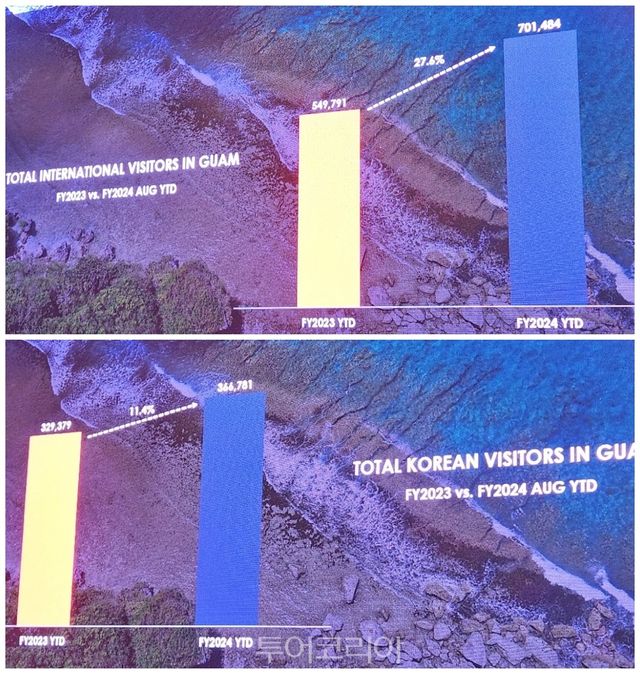 괌정부관광청에 따르면, 2024년 회계연도(2023년 10월~2024년 9월)에는 괌을 찾은 전체 해외 여행객 수는 약 70만명 정도로, 전년 동기 대비 약 26-27% 증가했다. 이 중 한국읜 괌 방문객수는 36만6천명 정도로, 9월 집계 미반영을 고려해도 약 40만 명을 약간 밑돌 것으로 추산된다.