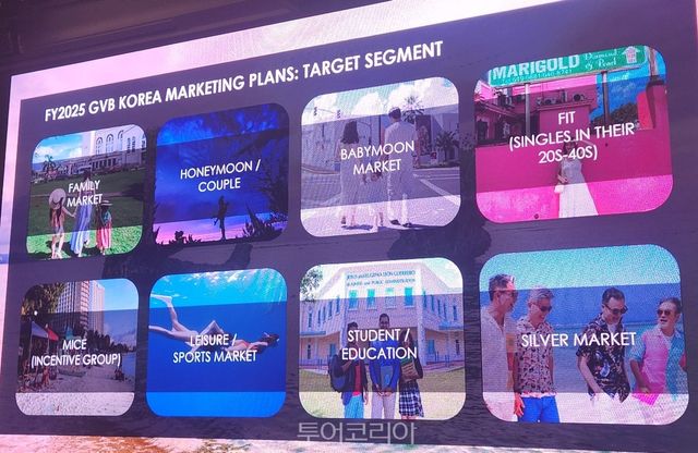 또 다양한 타킷을 통해 새로운 시장 발굴에도 나선다. 괌의 주요 타깃인 '가족', 허니문', '커플'은 물론 '친구끼지 여행', '태교여행',FIT(자유개별여행), 마이스, 레저스포츠 마케팅', 가장 가까운 미국인 괌에서의 영어 교육여행, '시니어 여행' 등 다양한 계층이 괌을 찾을 수 있도록 유도한다.