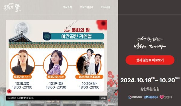 올해는 ‘대한민국 문화, 남원에서 피어나다’를 주제로 18일부터 20일까지 남원시 광한루원 일대에서 개최한다.